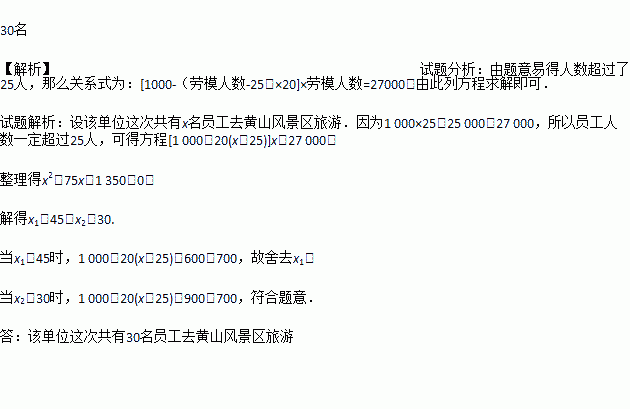 宿州高铁新区组织员工去黄山风景区旅游,共支付给万达旅行社旅游费用27 000元,请问该单位这次共有多少员工去黄山风景区旅游?