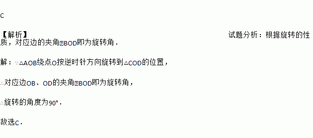 C 【解析】试题分析:根据旋转的性质,对应边的夹角∠BOD即为旋转角. 【解析】 ∵△AOB绕点O按逆时针方向旋转到△COD的位置, ∴对应边OB、OD的夹角∠BOD即为旋转角, ∴旋转的角度为90°. 故选C.