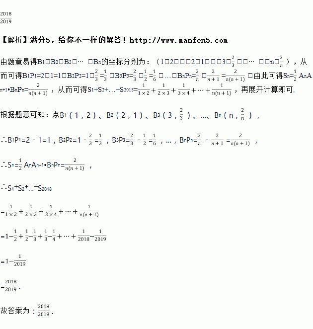 (x>0)的图象于点B1、B2、B3、…、Bn,过点B2作B2P1⊥A1B1于点P1,过点B3作B3P2⊥A2B2于点P2,…,若记△B1P1B2的面积为S1,△B2P2B3的面积为S2,…,△BnPnBn+1的面积为Sn,则S1+S2+…+S2018=_____.