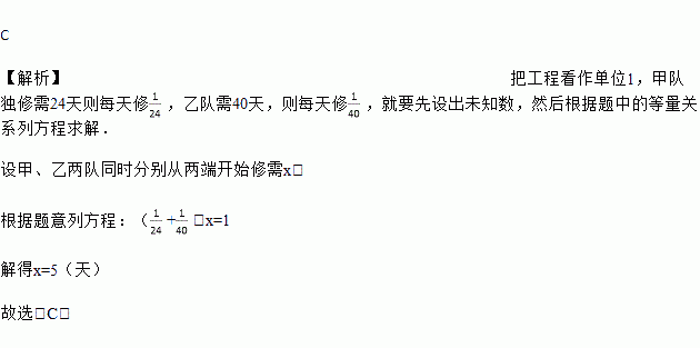 一条公路甲队独修需24天,乙队需40天,若甲、乙两队同时分别从两端开始修,( )天后可将全部修完.