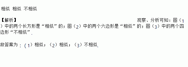 相似 相似 不相似 【解析】观察、分析可知:图(1)中的两个长方形是“相似”的;图(2)中的两个六边形是“相似”的;图(3)中的两个四边形“不相似”. 故答案为:(1)相似;(2)相似;(3)不相似.