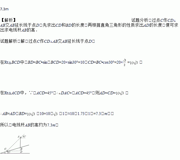 如图,在一个坡角为30°的斜坡上有一电线杆AB,当太阳光与水平线成45°角时,测得该杆在斜坡上的影长BC为20m.求电线杆AB的高(精确到0.1m,参考数值:≈1.73,≈1.41).