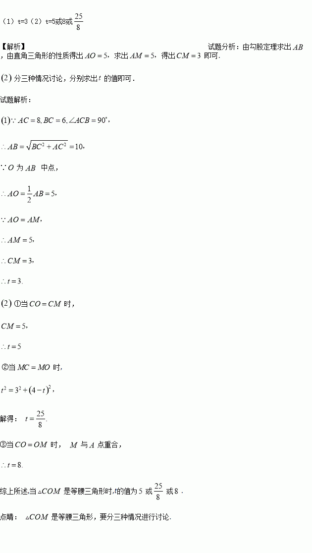 如图,在△ABC中,∠ACB=90°,BC=6cm,AC=8cm,点O为AB的中点,连接CO.点M在CA边上,从点C以1cm/秒的速度沿CA向点A运动,设运动时间为t秒.