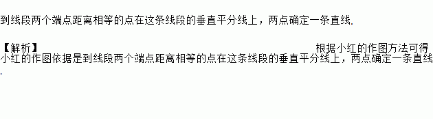 到线段两个端点距离相等的点在这条线段的垂直平分线上,两点确定一条直线. 【解析】根据小红的作图方法可得小红的作图依据是到线段两个端点距离相等的点在这条线段的垂直平分线上,两点确定一条直线.