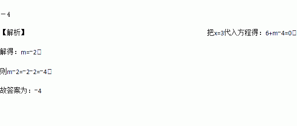 已知x=3是方程2x+m-4=0的一个解,则m﹣2 =________.