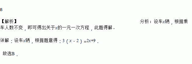 我国古代数学著作《孙子算经》中有“多人共车”问题:今有三人共车,二车空;二人共车,九人步.问人与车各几何?其大意是:每车坐3人,两车空出来;每车坐2人,多出9人无车坐. 问人数和车数各多少?设车辆,根据题意,可列出的方程是 ( ).![]()