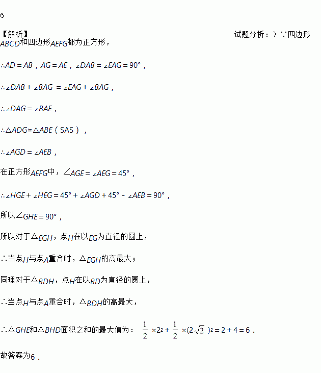 的正方形AEFG按图(1)位置放置,AD与AE在同一直线上,AB与AG在同一直线上,将正方形ABCD绕点A逆时针旋转如图(2),线段DG与线段BE相交,交点为H,则△GHE与△BHD面积之和的最大值为_________ ![]()