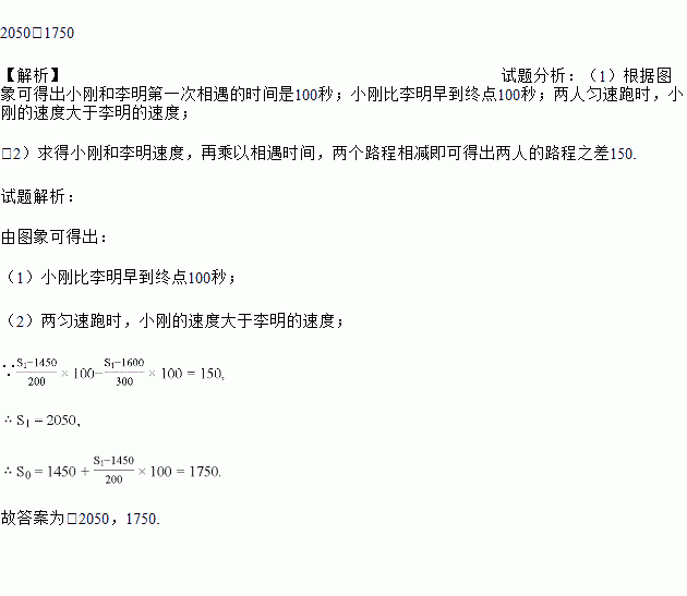 一次越野跑中,当李明跑了1600米时,小刚跑了1450米,此后两人匀速跑的路程s(米)与时间t(秒)的关系如图,结合结合图象,求图中S1和S0的位置.