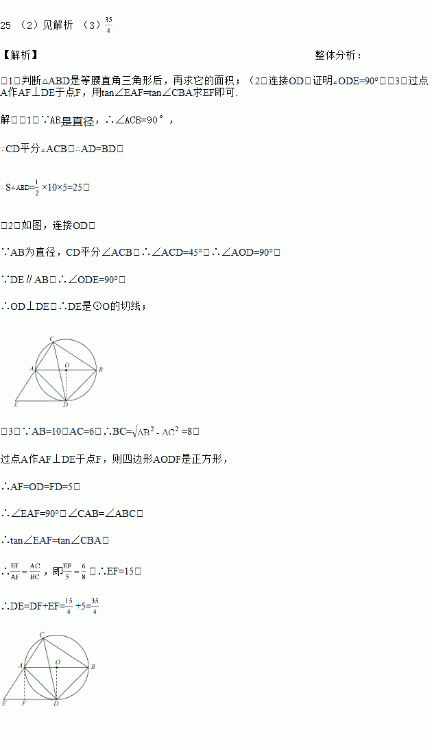 如图,⊙O的直径AB=10,弦AC=6,∠ACB的平分线交⊙O于点D,过点D作DE∥AB交CA延长线于点E,连接AD,BD.