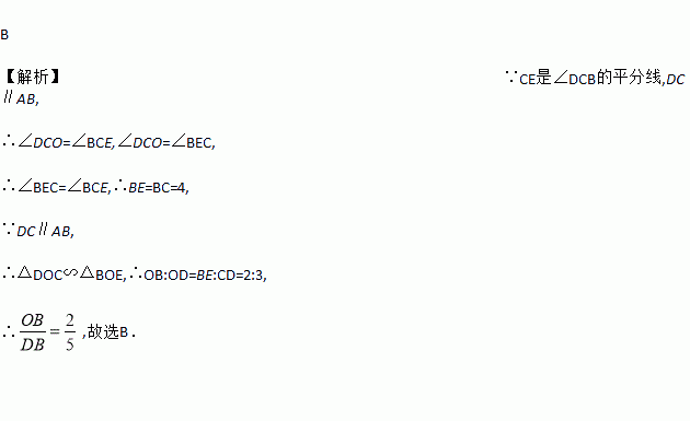 如图所示,在平行四边形ABCD中,CE是∠DCB的平分线,且交AB于E,DB与CE相交于O,已知AB=6,BC=4,则等于( )