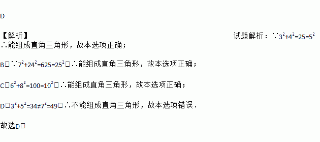 A. 3、4、5 B. 7、24、25 C. 6、8、10 D. 3、5、7