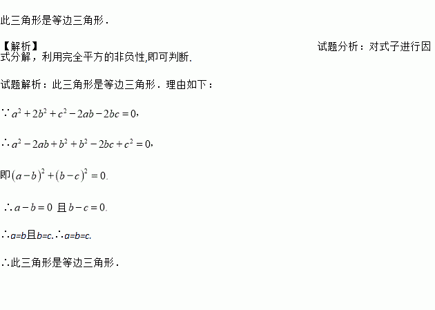 若一个三角形的三边长分别为a,b,c,且满足a2+2b2+c2-2ab-2bc=0,试判断该三角形的形状,并说明理由.