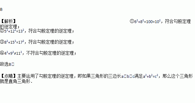 分别有下列几组数据:①6、8、10 ②12、13、5 ③ 17、8 、15 ④4、11、9其中能构成直角三形的有( )