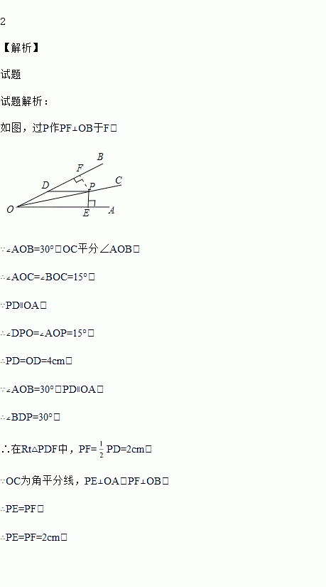 如图,∠AOB=30 度,OC 平分∠AOB,P 为 OC 上一点,PD∥OA 交OB 于 D,PE 垂直 OA 于 E,若 OD=4cm,求 PE 的长.