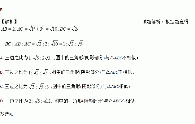 B 【解析】试题解析:根据题意得: A. 三边之比为 ,图中的三角形(阴影部分)与△ABC不相似; B. 三边之比为,图中的三角形(阴影部分)与△ABC不相似; C. 三边之比为,图中的三角形(阴影部分)与△ABC相似; D. 三边之比为图中的三角形(阴影部分)与△ABC不相似. 故选B.