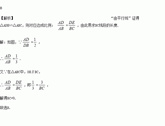 如图,在中,DE∥BC, , ,则BC的长是( )