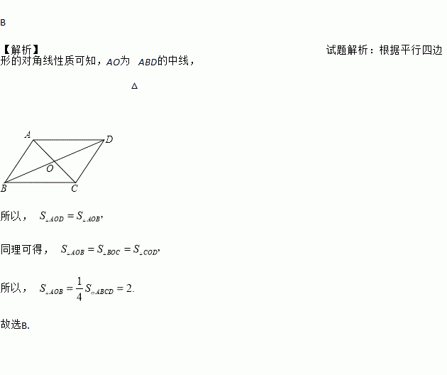 已知平行四边形ABCD的面积为8,O为两对角线的交点,则△AOB的面积是( )