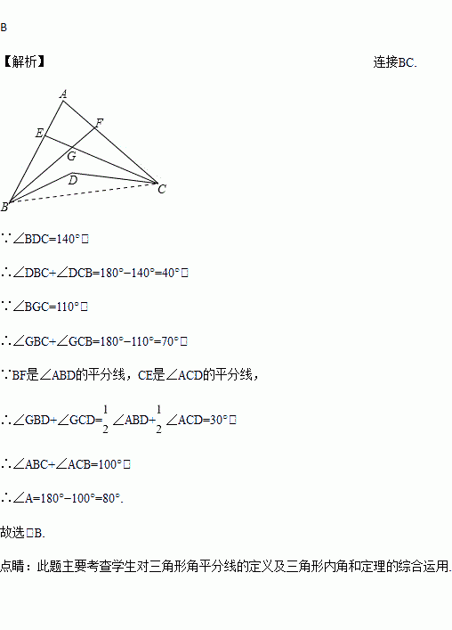 如图,BF是∠ABD的平分线,CE是∠ACD的平分线,BF与CE交于点G.若∠BDC=140°,∠BGC=110°,则∠A的度数为( )