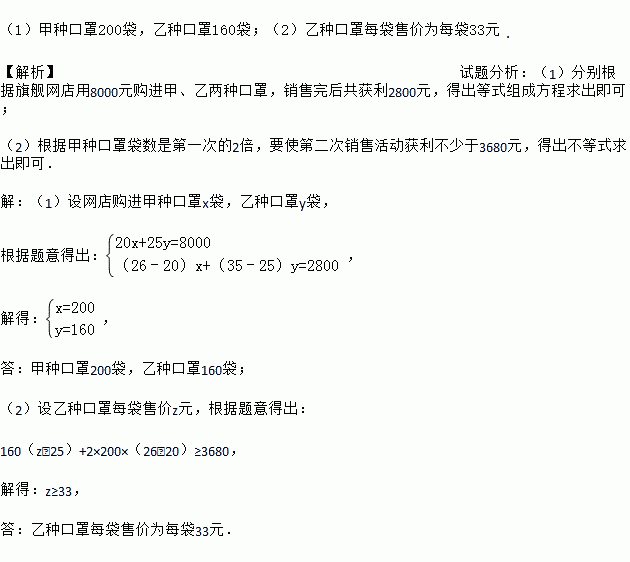(2)该网店第二次以原价购进甲、乙两种型号口罩,购进乙种型号口罩袋数不变,而购进甲种型号口罩袋数是第一次的2倍.甲种口罩按原售价出售,而乙种口罩让利销售.若两种型号的口罩都售完,要使第二次销售活动获利不少于3680元,乙种型号的口罩最低售价为每袋多少元?