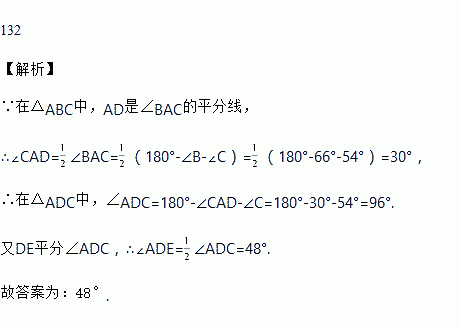 如图,在△ABC中,∠B=66°,∠C=54°,AD是∠BAC的平分线,DE平分∠ADC交AC于E,则∠BDE=_________。