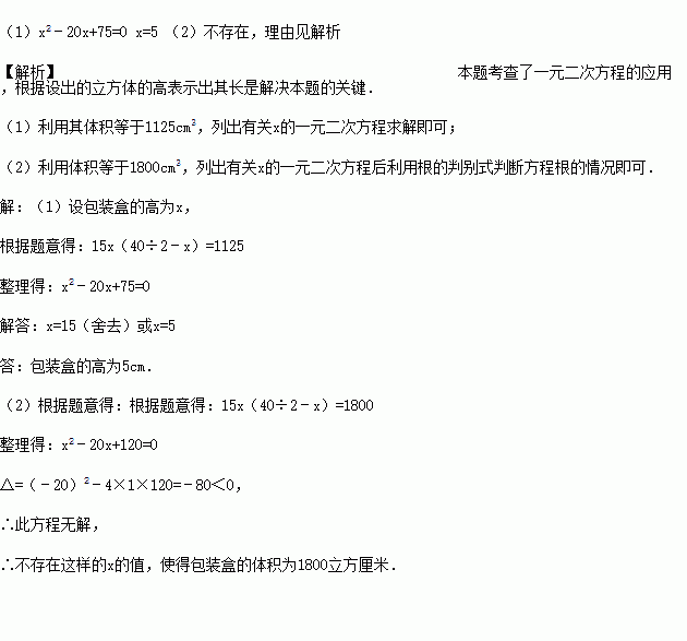 (1)若此包装盒的容积为1125cm3,请列出关于x的方程,并求出x的值;