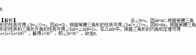 如图,在△ABC中,AB=AC,D为BC上一点,且DA=DC,BD=BA,则∠B的大小为