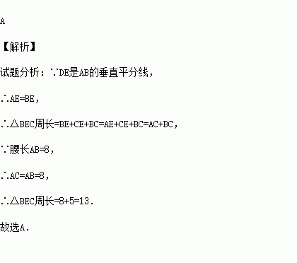 如图,等腰△ABC中,AB=AC=8,BC=5,AB的垂直平分线DE交AB于点D,交AC于点E,则△BEC的周长为( )