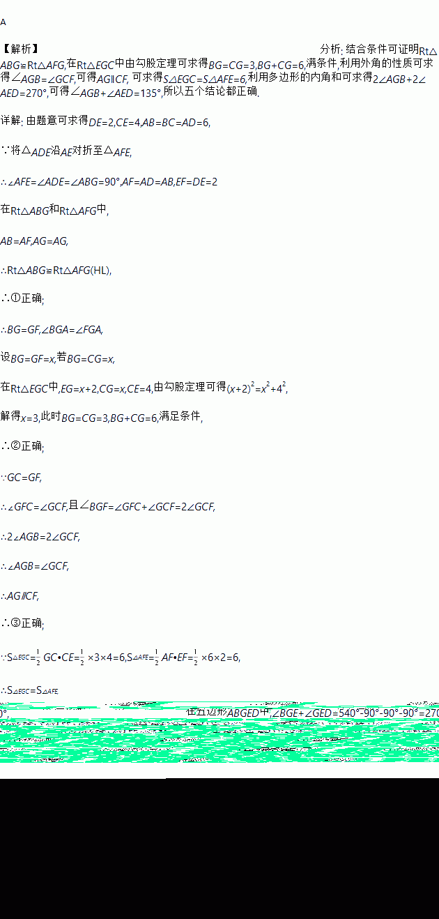 如图,正方形ABCD的边长为6,点E在边CD上,且CD=3DE.将△ADE沿AE对折至△AFE,延长EF交边BC于点G,连接AG、CF.则下列结论:①△ABG≌△AFG;②BG=CG;③AG∥CF;④S△EGC=S△AFE;⑤∠AGB+∠AED=135°.其中正确的个数是( )