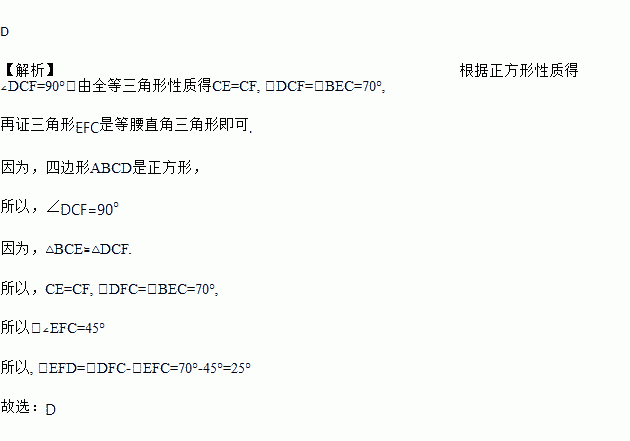 如图,在正方形ABCD中,E是DC上一点,F为BC延长线上一点,∠BEC=70°,且△BCE≌△DCF.连接EF,则∠EFD的度数是( )