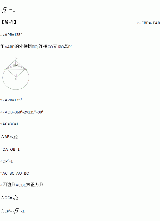 如图,在△ABC中,∠C=90°,AC=BC=1,P为△ABC内一个动点,∠PAB=∠PBC,则CP的最小值为_________.