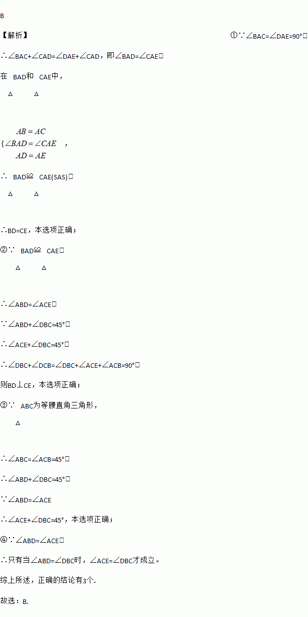 B 【解析】①∵∠BAC=∠DAE=90°, ∴∠BAC+∠CAD=∠DAE+∠CAD,即∠BAD=∠CAE, 在△BAD和△CAE中, , ∴△BAD≌△CAE(SAS), ∴BD=CE,本选项正确; ②∵△BAD≌△CAE, ∴∠ABD=∠ACE, ∵∠ABD+∠DBC=45°, ∴∠ACE+∠DBC=45°, ∴∠DBC+∠D...
