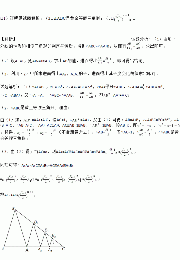 (3)应用:已知AC=a,作A1B1∥AB交BC于B1,B1A2平分∠A1B1C交AC于A2,作A2B2∥AB交B2,B2A3平分∠A2B2C交AC于A3,作A3B3∥AB交BC于B3,…,依此规律操作下去,用含a,n的代数式表示An﹣1An.(n为大于1的整数,直接回答,不必说明理由)