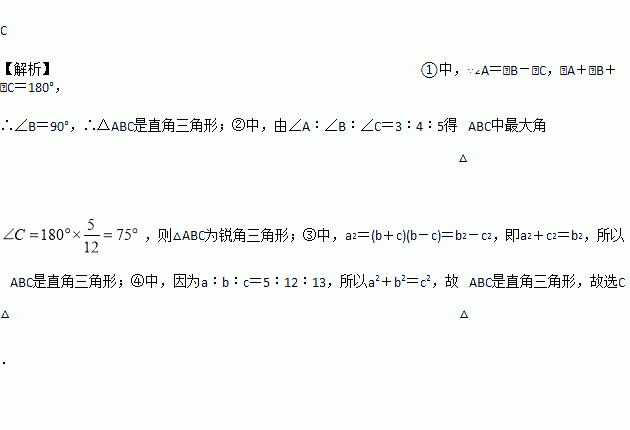 △ABC的三边长分别为a,b,c,下列条件:①∠A=∠B-∠C;②∠A:∠B:∠C=3:4:5;③a2=(b+c)(b-c);④a:b:c=5:12:13,其中能判断△ABC是直角三角形的个数有( )