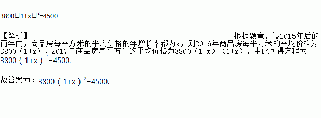 3800(1+x)2=4500 【解析】根据题意,设2015年后的两年内,商品房每平方米的平均价格的年增长率都为x,则2016年商品房每平方米的平均价格为3800(1+x),2017年商品房每平方米的平均价格为3800(1+x)(1+x),由此可得方程为3800(1+x)2=4500. 故答案为:3800(1+x)2=4500.