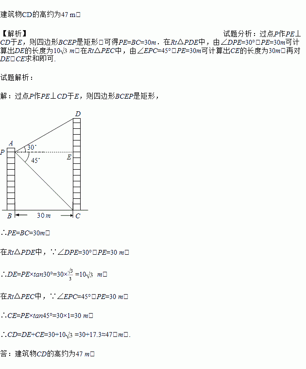 如图所示,两个建筑物AB和CD的水平距离为30m,张明同学住在建筑物AB内10楼P室,他观测建筑物CD楼的顶部D处的仰角为30°,测得底部C处的俯角为45°,求建筑物CD的高度.(