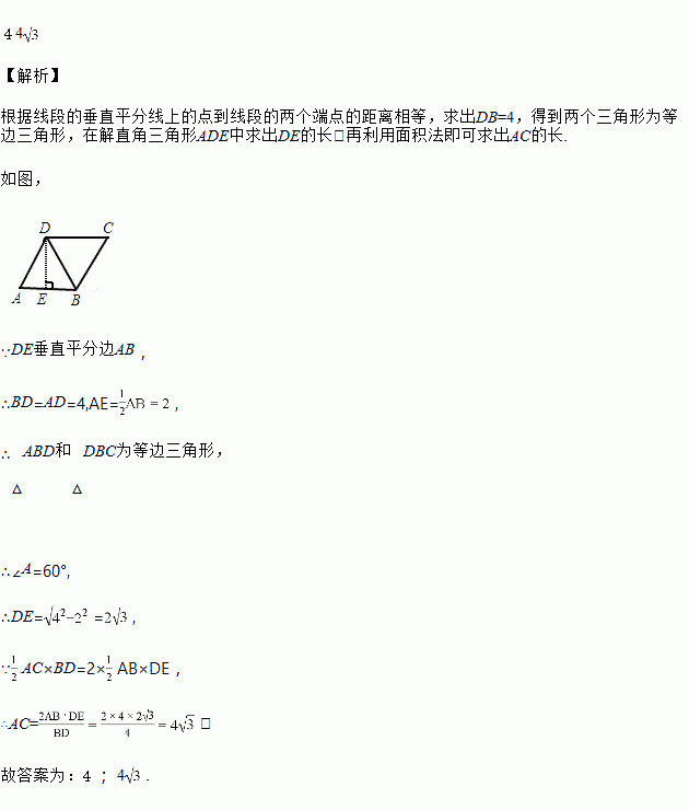 在菱形ABCD中,AB=4,AB边上的高DE垂直平分边AB,则BD=_____,AC=_____.