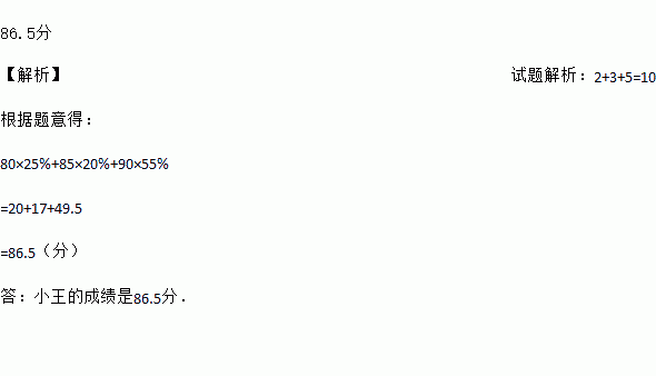 86.5分 【解析】试题解析:2+3+5=10 根据题意得: 80×25%+85×20%+90×55% =20+17+49.5 =86.5(分) 答:小王的成绩是86.5分.