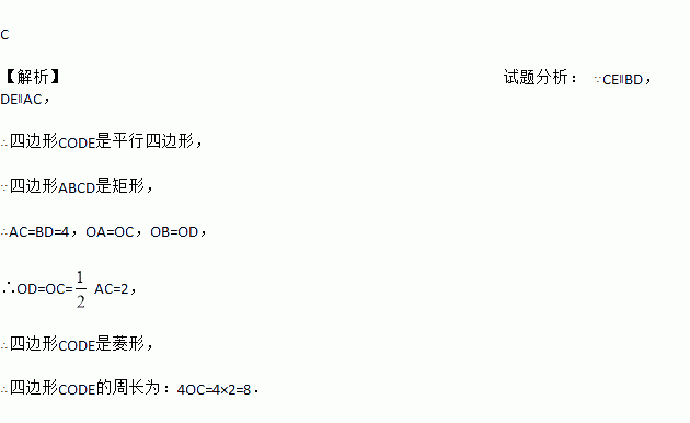 如图,矩形ABCD的对角线AC、BD相交于点O,CE∥BD,DE∥AC,若AC=4,则四边形CODE的周长( )