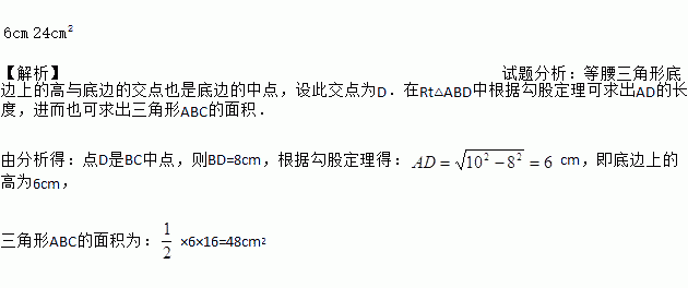 等腰△ABC的腰长AB=10cm,底BC为16cm,则底边上的高为______,面积为______.