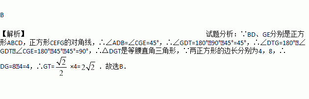 如图,边长分别为4和8的两个正方形ABCD和CEFG并排放在一起,连结BD并延长交EG于点T,交FG于点P,则GT=( )