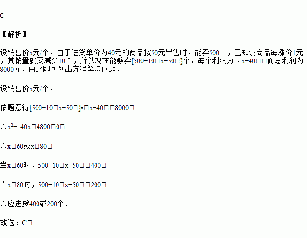 将进货单价为40元的商品按50元出售时,能卖500个,已知该商品每涨价1元,其销量就要减少10个,为了赚8 000元利润,则应进货( )