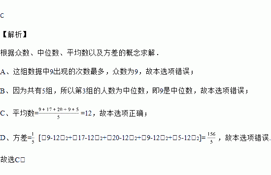 A. 众数是20 B. 中位数是17 C. 平均数是12 D. 方差是26