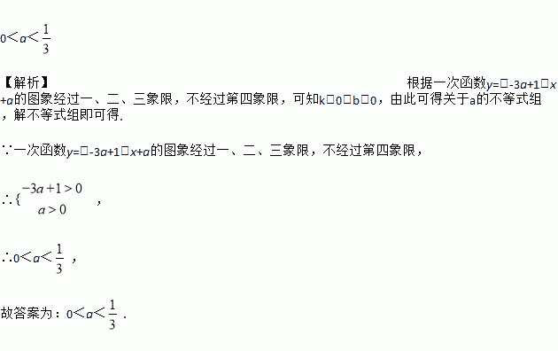 已知一次函数y=(-3a+1)x+a的图象经过一、二、三象限,不经过第四象限,则a的取值范围是______ .