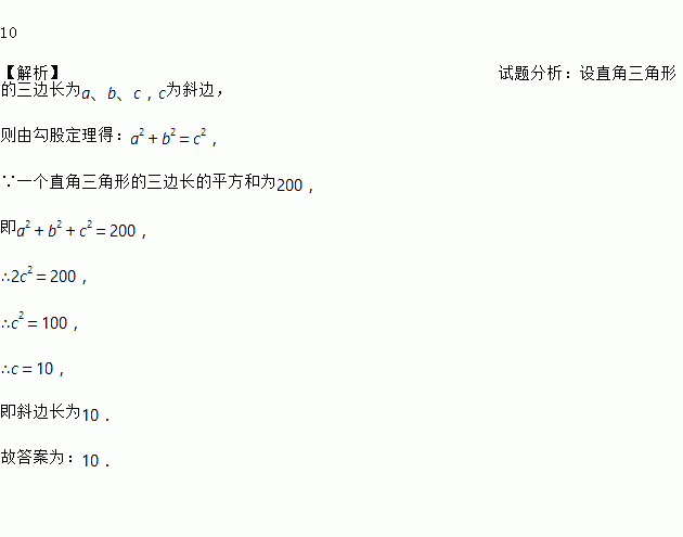 一个直角三角形的三边长的平方和为200,则斜边长为________