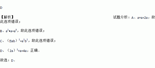 A. a+a=2a2 B. a2•a=2a3 C. (﹣ab)2=ab2 D. (2a)2÷a=4a