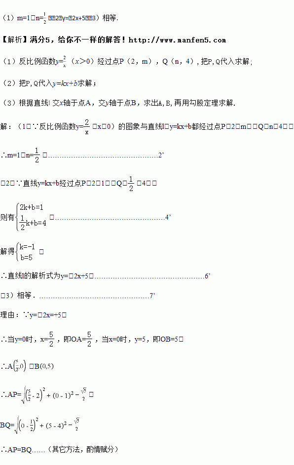 (x>0)的图象与直线:y=kx+b都经过点P(2,m),Q(n,4),且直线![]()