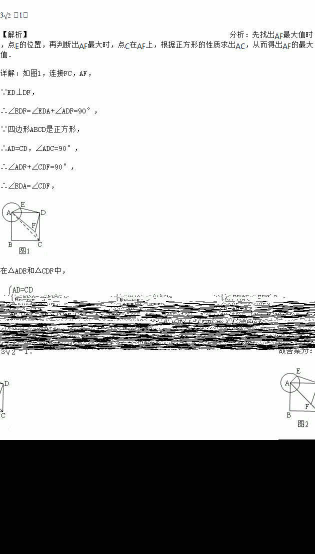 如图,已知正方形ABCD的边长为3,以点A为圆心,1为半径作圆,E是⊙A上的任意一点,将DE绕点D按逆时针旋转90°,得到DF,连接AF,则AF的最小值是_____.