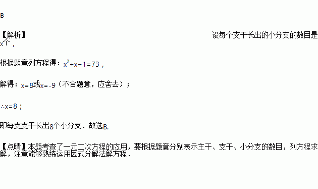 某种植物的主干长出若干数目的支干,每个支干又长出相同数目的小分支,若小分支、支干和主干的总数目是73,则每个支干长出的小分支的数目为( )