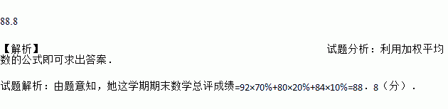 某校规定学生期末数学总评成绩由三部分构成:卷面成绩、课外论文成绩、平日表现成绩(三部分所占比例如图),若方方的三部分得分依次是92、80、84,则她这学期期末数学总评成绩是多少?