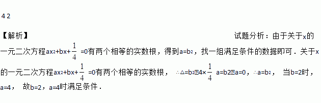 关于x的一元二次方程ax2+bx+=0有两个相等的实数根,写出一组满足条件的实数a,b的值:a=________,b=________.